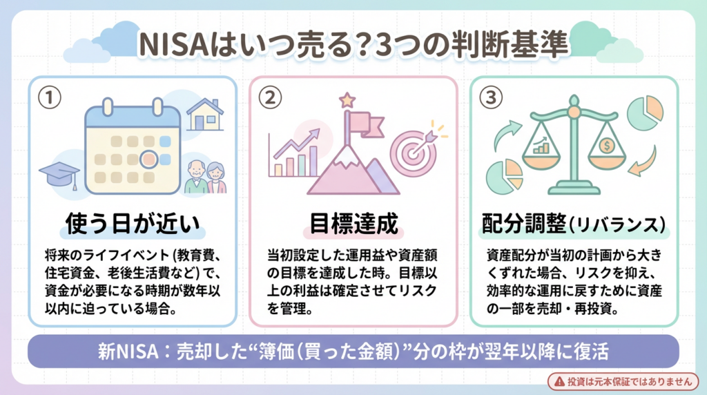 結論から言うと、NISAの売却タイミングは 相場ではなく“あなたの目的と時期”で決める のが正解です。