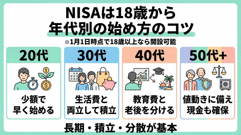 NISAは1月1日時点で18歳以上なら始められます。20代は「早く始める」、30代は「家計と両立」、40代は「目的別に分ける」、50代以降は「守りを意識する」が大きなコツです。共通する正解は、長期・積立・分散を、無理のない額で続けることです。